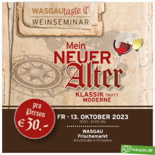 26. September 2023 WASGAU taste it! "Mein neuer Alter" - so lautet das Thema unseres aktuellen Weinseminars mit Verkostung am 13. Oktober 2023...