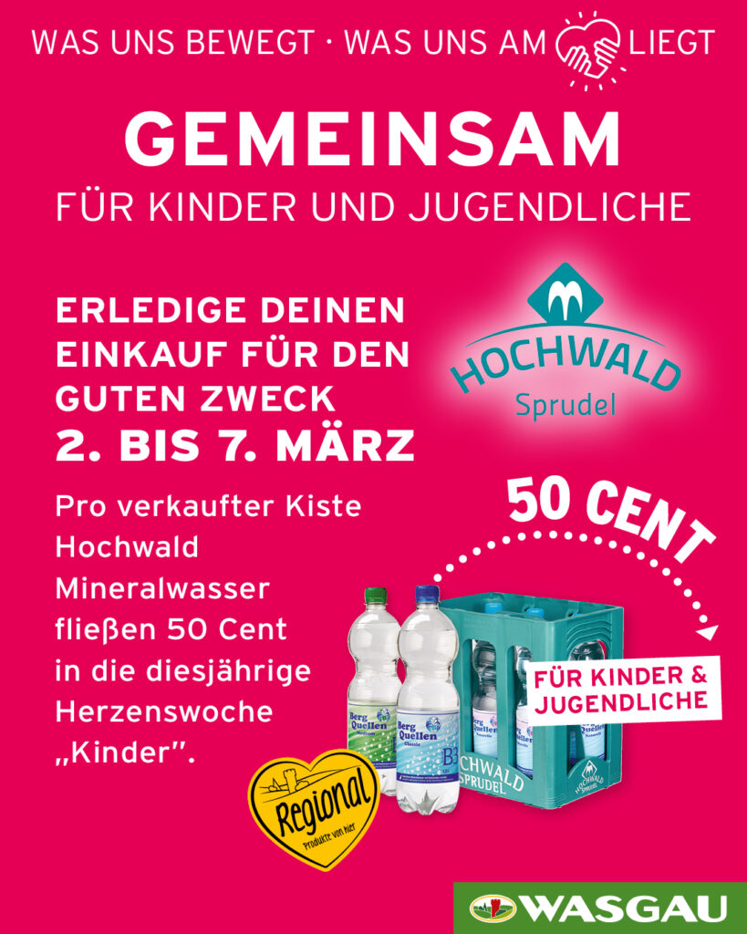 Pro verkaufter Kiste Hochwald Berg Quellen Mineralwasser fließen 50 Cent in die diesjährige Herzenswoche Kinder. Der Erlös wird direkt in soziale, kreative und sportliche Projekte für Kinder und Jugendliche in unserer WASGAU Region eingesetzt. In diesem Jahr verlosen wir unter allen Bewerbern je einen von sechs Trikotsätzen für eine Kinder- oder Jugendmannschaft - natürlich in der entsprechenden Wunschfarbe. Hier Online-Formular ausfüllen.