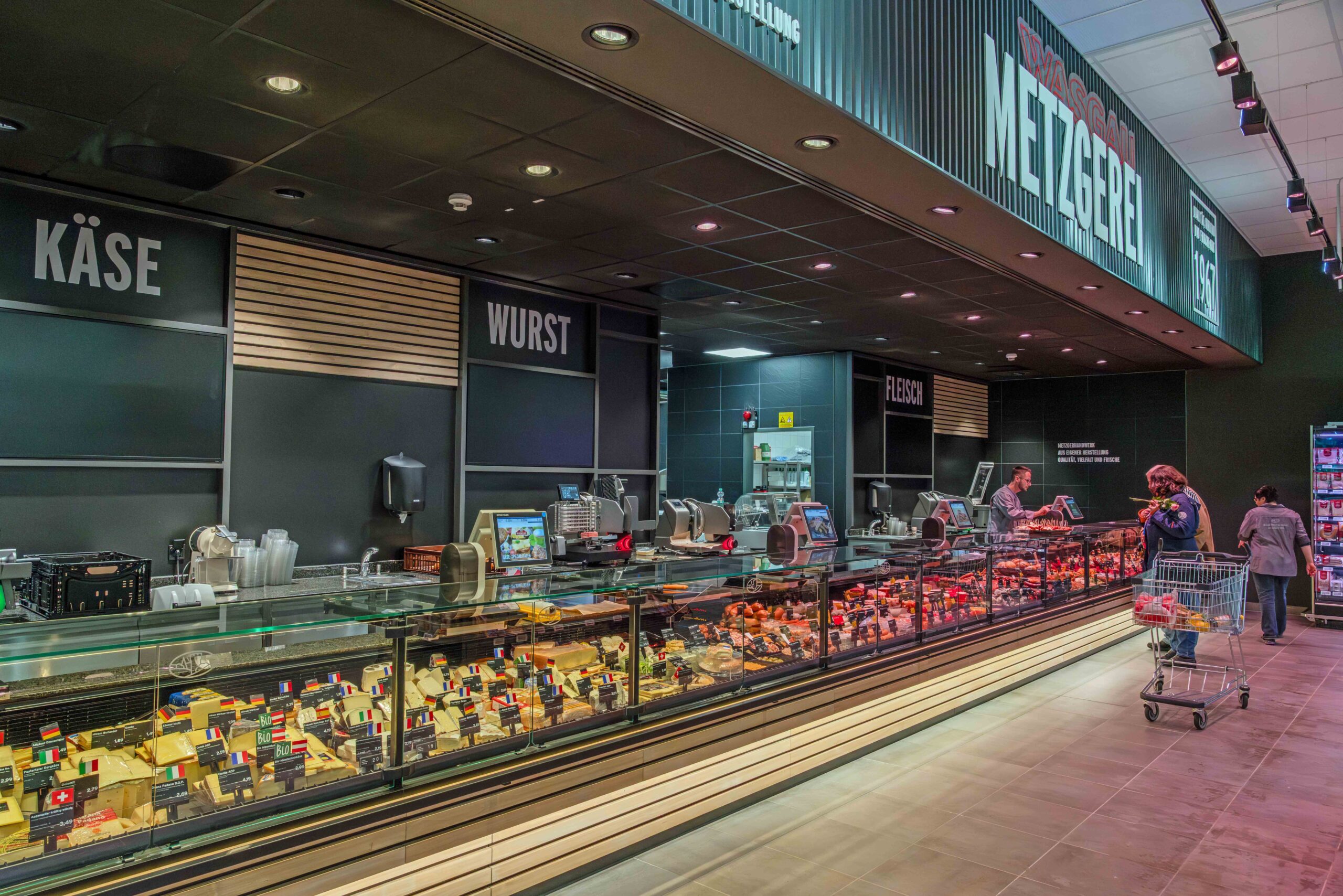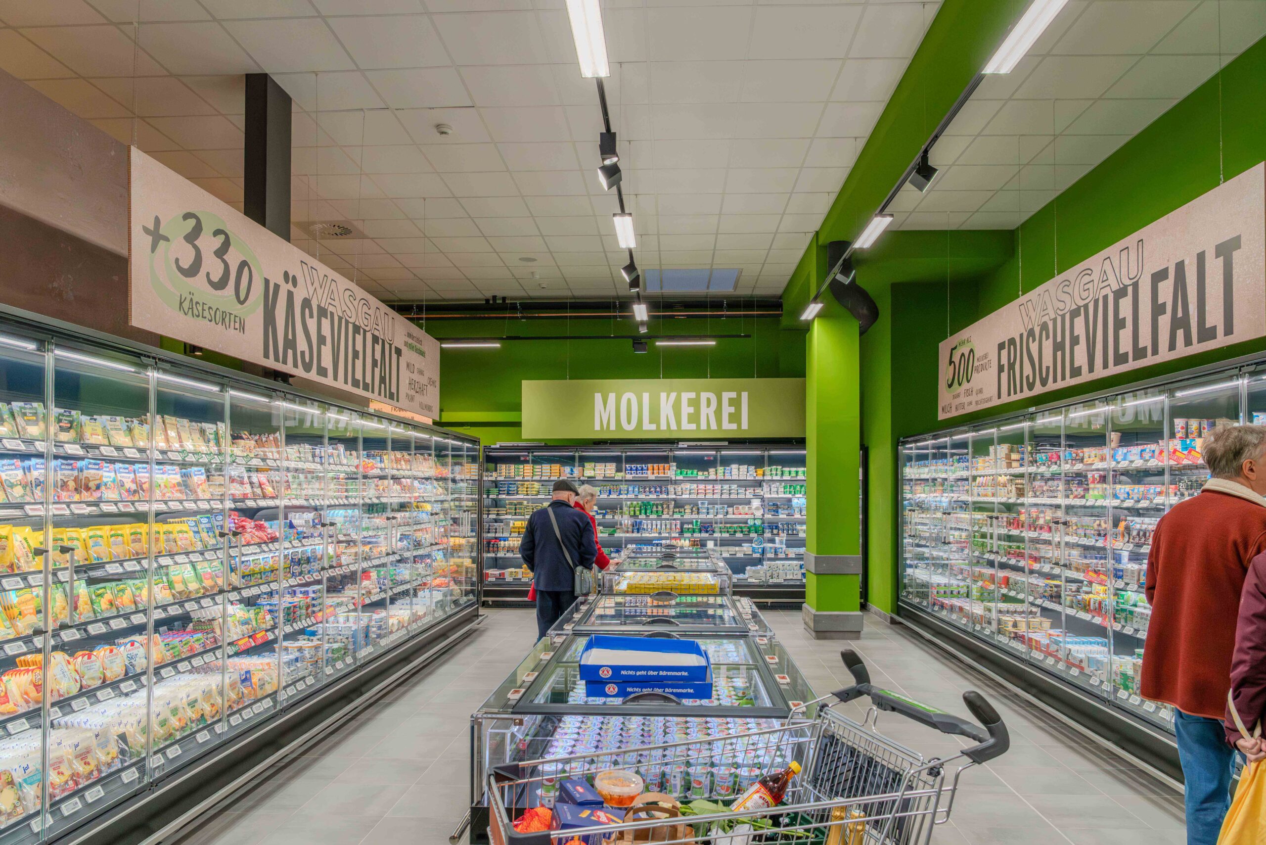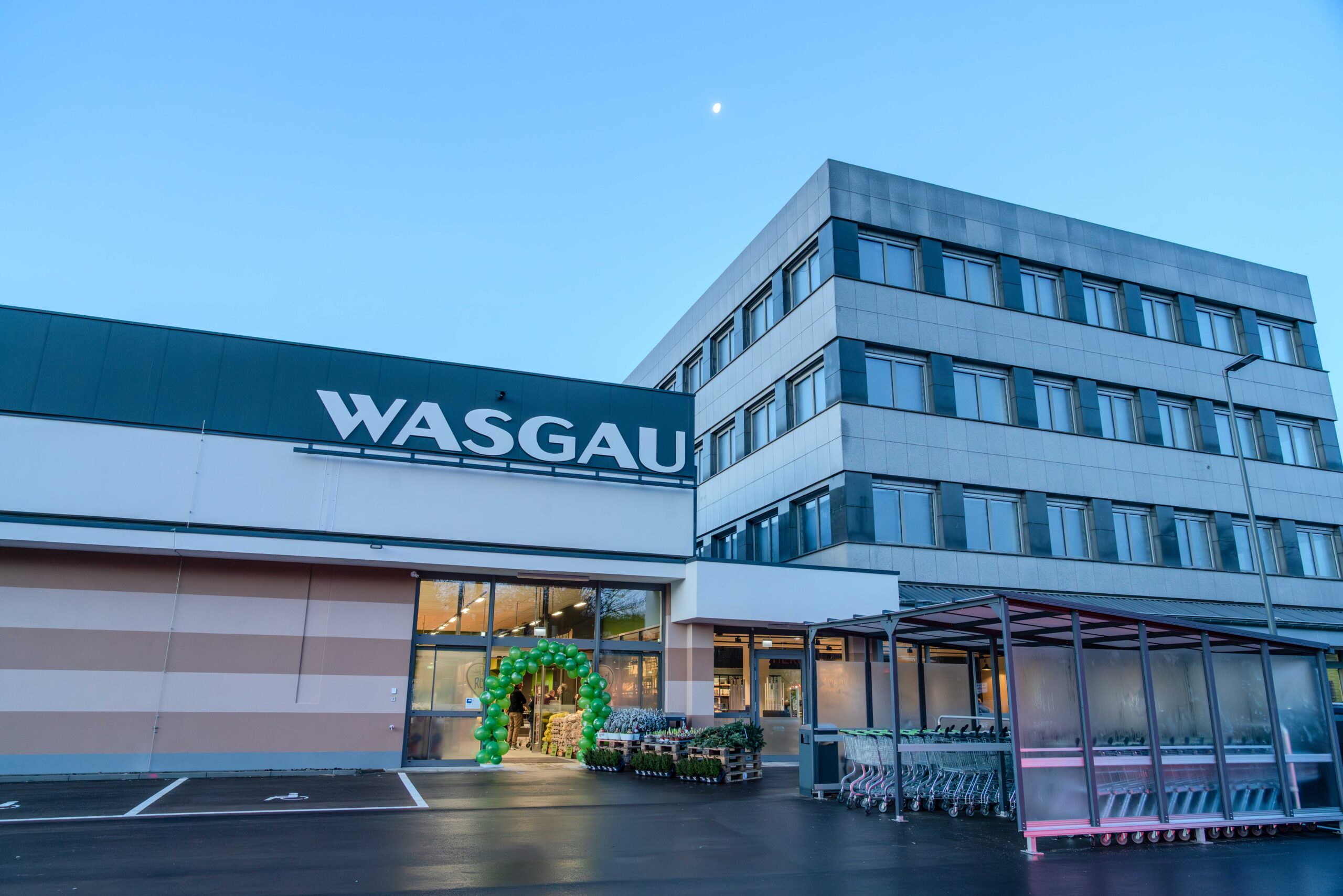 Für den neuen WASGAU Frischemarkt am Kieselhumes wurde das bestehende, ehemals vom Autoteile-Unternehmen Stahlgruber genutzte Gebäude über einen Zeitraum von sechs Monaten aufwändig saniert und renoviert. Getreu der WASGAU Nachhaltigkeitsphilosophie erfolgte der Umbau der Immobilie dabei wie bei allen Neu- und Umbauten von WASGAU Märkten nach den Prinzipien des Green Building. Dies beinhaltet insbesondere den kompletten Verzicht auf fossile Brennstoffe sowie eine effizient gesteuerte LED-Beleuchtung im gesamten Innen- und Außenbereich, die Einsparungen zwischen 30 und 45 Prozent bewirkt. Für die erforderliche Gewerbekälte kommt zukunftssichere und nachhaltige CO2-Technik zum Einsatz; bei den Kühlmöbeln reduzieren Deckel und Türen deutlich die Energieverluste. Neben einer Wärmerückgewinnung der Kältemaschine sind im Markt Luft-Wasser-Wärmepumpen mit effizienten Deckenlufterhitzern installiert. Über eine Eco-Link-Anlage ist es möglich, die Haustechnik aus der Ferne zu steuern und zu warten. Nicht zuletzt wurde außerhalb des Gebäudes noch eine Grünanlage mit 18 Bäumen und Bodendeckern gestaltet. Baulich-technisch liegen die Baukosten bei 2,5 Mio. Euro, hinzu kamen weitere 1,8 Mio. Euro für die Einrichtung.