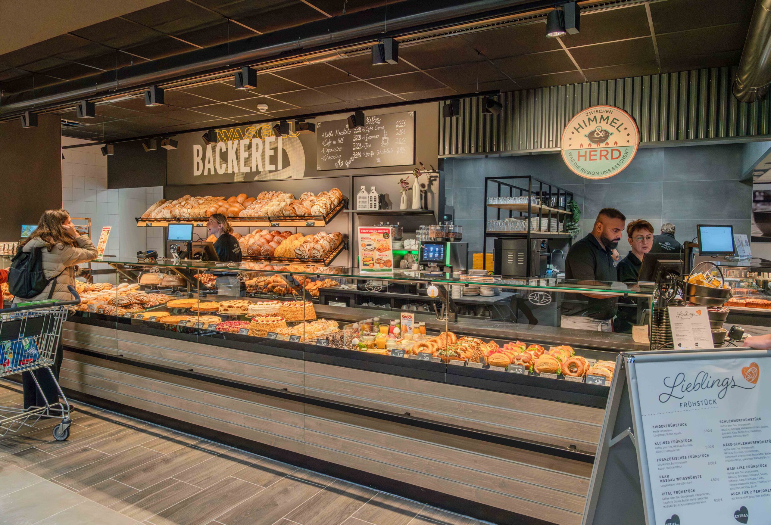 Der Markt unter Leitung von Joachim Scheid ist montags bis samstags jeweils von 8.00 bis 20.00 Uhr geöffnet. Die WASGAU Bäckerei öffnet täglich bereits um 7.00 Uhr mit frischen Backwaren, wechselnden Kuchen- und Tortenspezialitäten und Feingebäck, Getränken to-go sowie kalten und warmen Snacks; an den Sonntagen ist das Team der Bedientheke von 7.30 bis 17.00 Uhr vor Ort. Im gemütlich eingerichteten Café mit insgesamt 55 Sitzplätzen im Innen- und Außenbereich können die Kunden am Morgen aus einer reichhaltigen Frühstückskarte auswählen und jederzeit Getränke, Kuchen und Snacks genießen. Die WASGAU-eigene Gastronomie „Himmel und Herd“ bietet außerdem über den ganzen Tag abwechslungsreiche Bistro-Gerichte wie Pizza, Flammkuchen und Salate sowie einen täglichen Mittagstisch.
