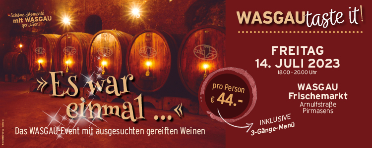Die WASGAU taste it! Event-Reihe geht in eine neue Runde. Unter dem Motto "Es war einmal ..." werden ausgesuchte gereifte Weine verkostet. Begleitet von einem fein abgestimmten 3-Gänge-Menü. Wir freuen uns Sie am Freitag 14. Juli 2023 im WASGAU Frischemarkt Arnulfstraße in Pirmasens begrüßen zu dürfen. Tickets erhalten Sie im Vorverkauf an der Kasse des Frischemarkts für 44,- pro Person.